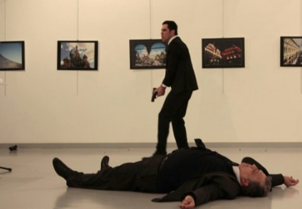 وظهر في صور نشرتها وسائل اعلام تركية السفير الروسي ممدا ارضا وبالقرب منه رجل يحمل مسدسا.