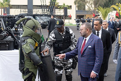 و تفقد الملك وحدات لمجموعة التدخل السريع التابعة لذات المديرية واطلع على أحدث التجهيزات والمركبات والوسائل اللوجستيكية التي يتم استخدامها في التدخلات الخاصة بالتصدي للتهديدات الإرهابية ومحاربة مختلف أشكال الجريمة المنظمة بما فيها الجريمة العابرة للحدود.
