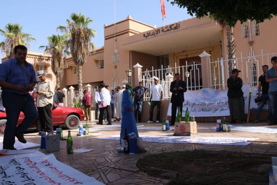اختار ضحايا مافيا العقار بتيزنيت وسيدي إفني و كلميم،  الثلاثاء، “قوالب من السكر” وقنينات الخمر، للاحتجاج في وقفة  أمام محكمة تيزنيت، تزامنا مع مناقشة أحد الملفات العقارية، والتي يتابع فيها 14متهما، قضت المحكمة ببراءتهم من المنسوب إليهم.