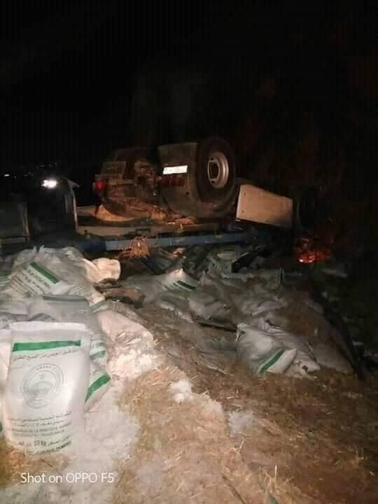 الحادث نجم عن اصطدامبين شاحنة ذات مقطورة  محملة بأكياس الدقيق، وسيارة خفيفة وشاحنة كانت محملة بالتبن.