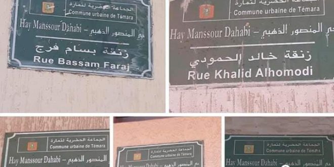 عمد موح الرجدالي، رئيس المجلس البلدي لتمارة، والقيادي بحزب العدالة والتنمية، إلى إعطاء تعليماته لمصالح الجماعة بإزالة لافتات من الأزقة التي تحمل أسماء تعود لمشايخ ودعاة معروفين بالتطرف والتشدد اطلقها المجلس مند 2006 في عملية شبه تدليسية تحت بند تسمية ازقة باسماء "صحابة الرسول" كما جاء في محضر دورة سابقة للمجلس.