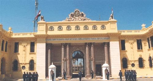 وأضاف أن "القصر به عدد من القاعات المذهلة في جمالها أهمها صالون الوزراء وقاعة الفرمانات وأجنحة الملك والملكة والأميرات إضافة إلى القاعة المستديرة التي وقع فيها فاروق وثيقة التنازل عن العرش. أما باب القصر فيتكون من ستة أعمدة جرانيتية تعلوها تيجان من النحاس وكتب عليها "العدل ميزان الأمن".