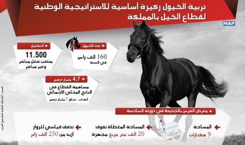 وتعتبر تربية الخيول الرهان الأساسي للاستراتيجية الوطنية لقطاع الخيل التي تهدف إلى مضاعفة مساهمة القطاع في الناتج المحلي الإجمالي في أفق سنة 2020، و يقدر هذا الناتج حاليا ب4,7 مليار درهم (0,5 بالمائة من الناتج المحلي الإجمالي). ويستوعب هذا القطاع 11 ألف و500 منصب شغل مباشر وغير مباشر.