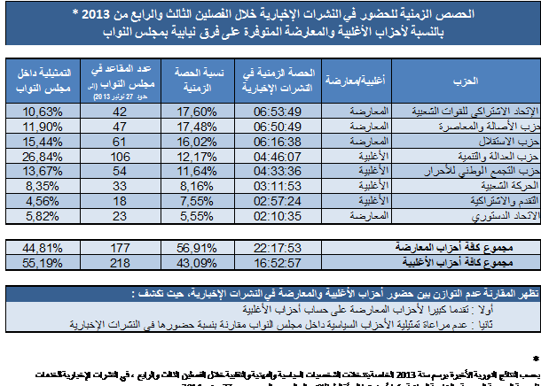 أظهرت إحصائيات دورية حول نسبة حضور الاحزاب السياسية في القنوات العمومية نتائج عكسية. فقد أظهرت الاحصئيات للحصص الزمينة في النشرات الاخبارية خلال الفصلين الثالث و الرابع من 2013 بالنسبة لاحزاب الاغلبية و المعارضة المتوفرة على فرق برلمانية، هيمنة احزاب المعارضة على الاغلبية.