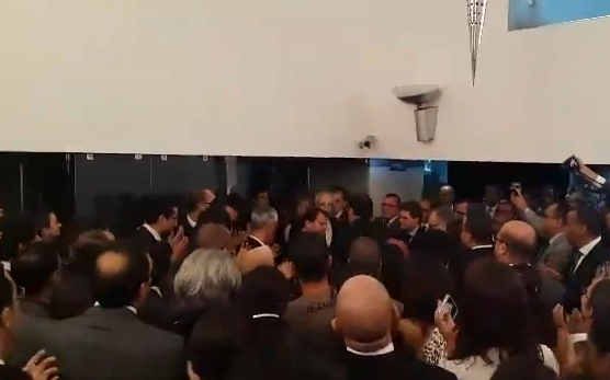 نفس الشخص استقبله الموظفون الغاضبون بالصفير و الشعارات المطالبة برحيله شهر شتنبر الماضي، و منددين بالزبونية و المحسوبية في الصندوق.