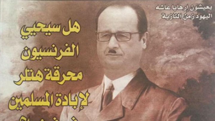 ويظهر هولاند بزي عسكري نازي وبشارب يشبه شارب هتلر، فيما عنونت الصحيفة صفحتها الأولى "هل سيحيي الفرنسيون محرقة هتلر لإبادة المسلمين في فرنسا"، مضيفة في أعلى الصفحة "يعيشون (يعني مسلمو فرنسا) إرهابا عاشه اليهود زمن النازية.
