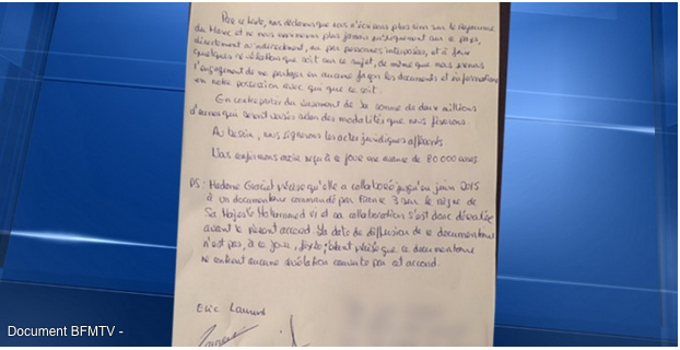 من جهتها ، نشرت القناة التلفزية الفرنسية (بي .إف.إم. تي.في) اليوم السبت، الوثيقة الخطية التي وقع عليها الصحفيان، إيريك لوران، وكاثرين غراسيي، المتهمين بمحاولة ابتزاز المغرب، وهو ما يشكل حجة دامغة على تورطهما.