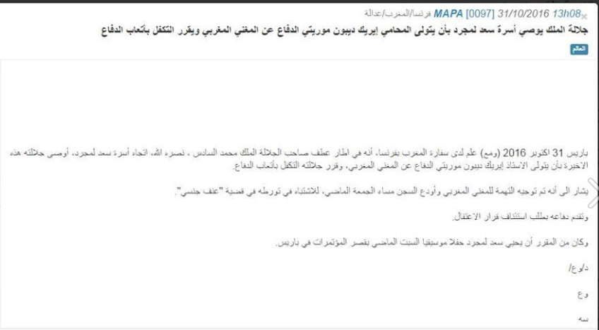 حذفت وكالة المغرب العربي للأنباء خبرا ذكرت من خلاله أن الملك محمد السادس هو من أوصى أسرة المغني سعد المجرد، المعتقل في فرنسا على ذمة اتهامه بمحاولة اغتصاب فتاة فرنسية، بأن يتولى المحامي" إيريك ديبون موريتي "الدفاع عن سعد لمجرد، كما قرر الملك التكفل بأتعاب الدفاع.